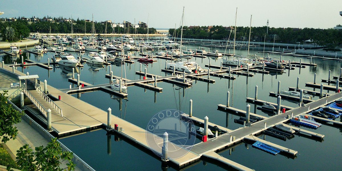Considering the climate in Hainan Province and combining with the structural design of wind-proof and shock-absorbing performance, we built 291 berths in the first phase with aluminum alloy pontoon system whose main structure and fittings used ultraviolet protection. Although the pontoon system has been in operation for nearly 10 years, the overall structure and performance are in good condition, with no obvious color difference in appearance and low maintenance cost.
