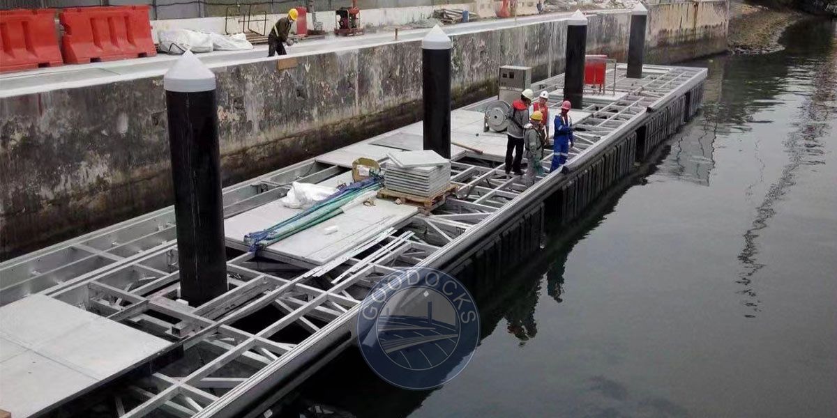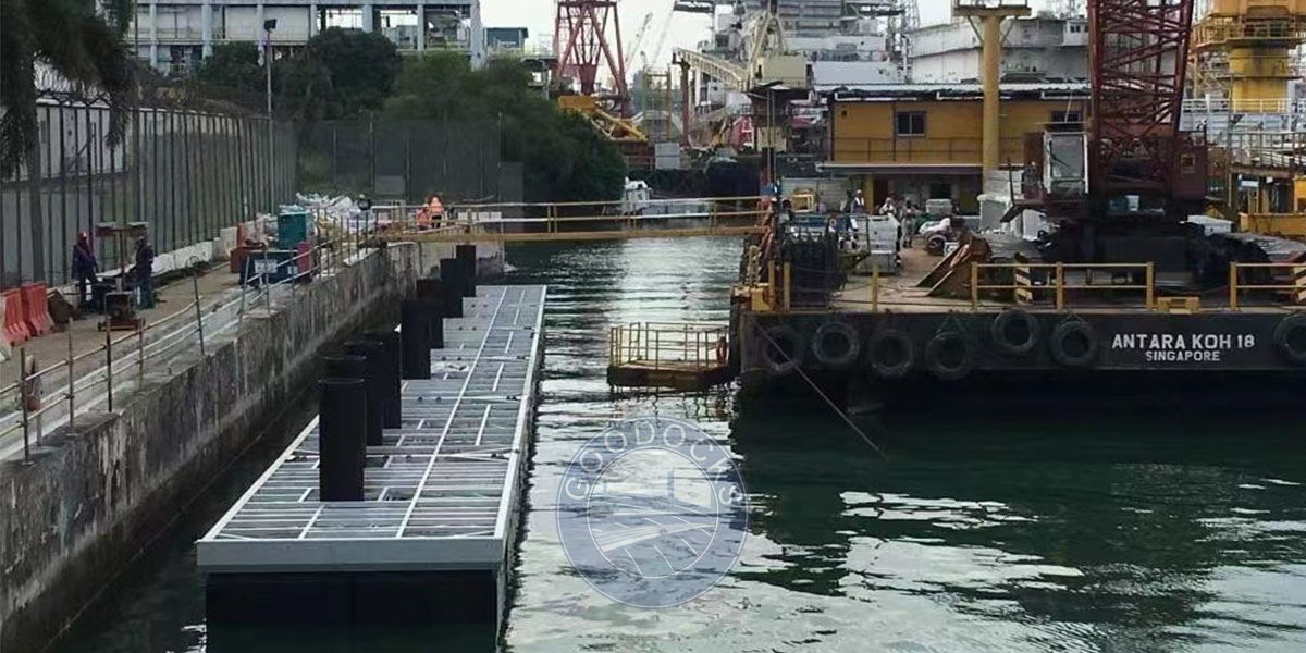 Based on this difficulty, our engineering team customized the pontoon structure that could resist high impact horizontal force after strict and meticulous calculation, and installed D150MM*40mm rubber fender, which solved the project problem and stood out among all bidding schemes. Then the project finally came to a successful conclusion. The owner, Singapore Marine Police Department and main contractor, Singapore Anda Maritime Company sincerely expressed their appreciation to Goodocks for all the thing we’ve done. In addition, a pontoon of offshore gas station had been built in this project to facilitate the daily refueling of marine police vessels.